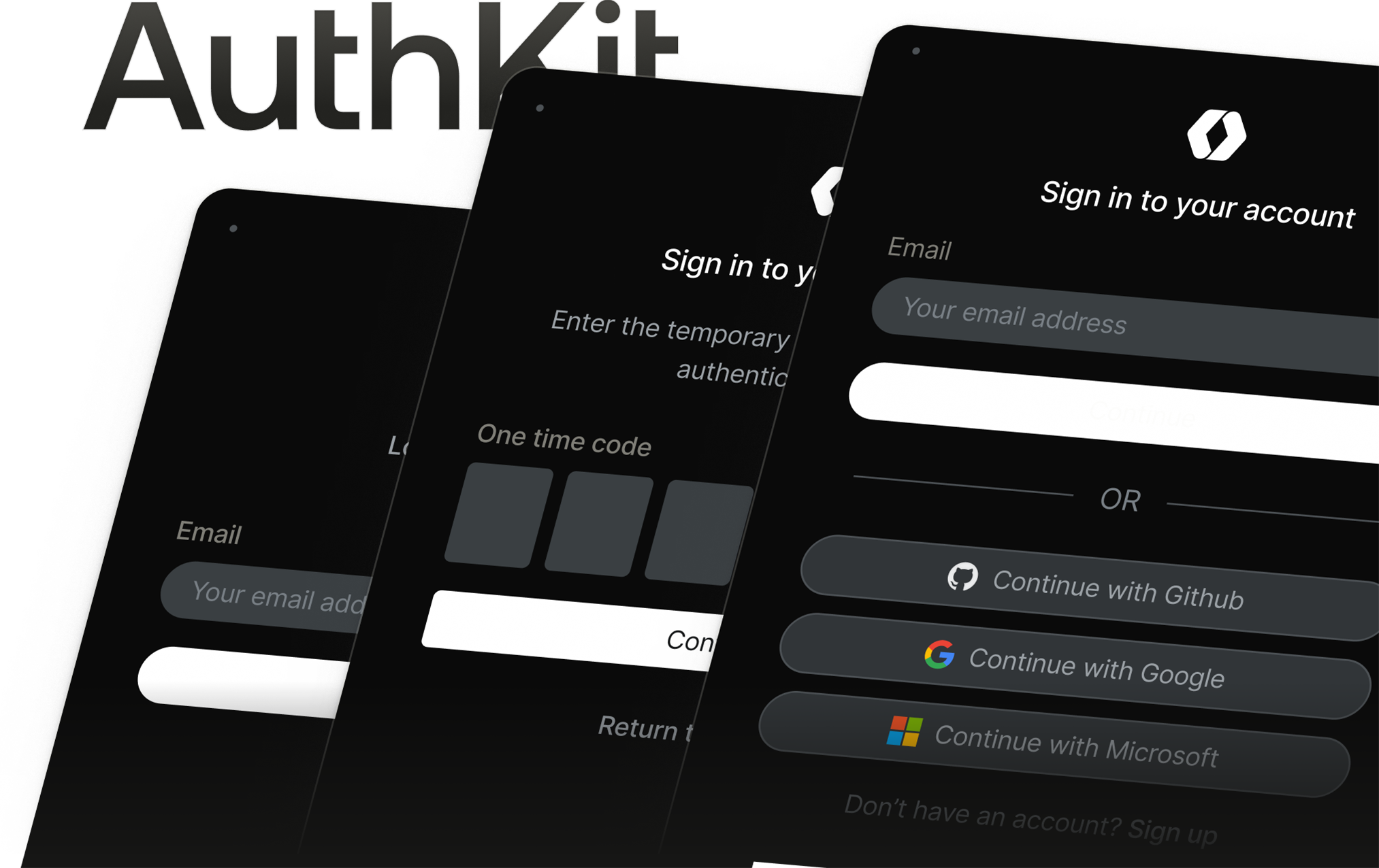 使用 GitHub、Google、Microsoft 或 Apple ID 登入、通行金鑰支援、透過電子郵件發送代碼、內建速率限制、地理保護和 SSO。 了解更多